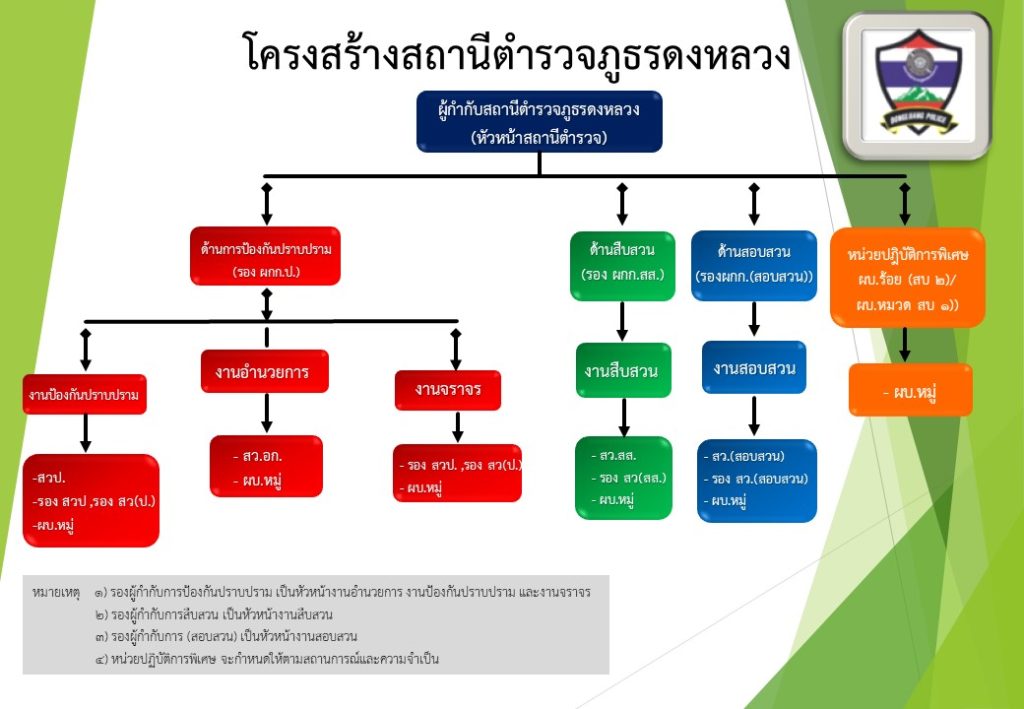 ที่แสดงถึงการแบ่งสายงานต่าง ๆ ภายในหน่วยงาน (ตามรูปแบบโครงสร้างสถานีตำรวจ)